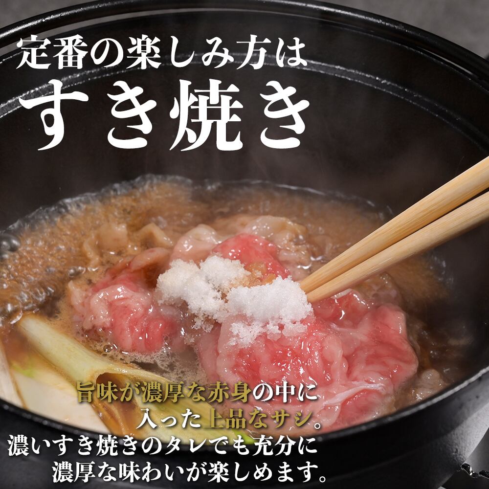 宮崎牛ロースは、赤身と脂肪の絶妙なバランスを保ちつつ、しっかりとした肉の旨味が味わえます。柔らかさと食べ応えを兼ね備え、特別な日や家族と楽しむすき焼きに最適ですので、ぜひお試しください。